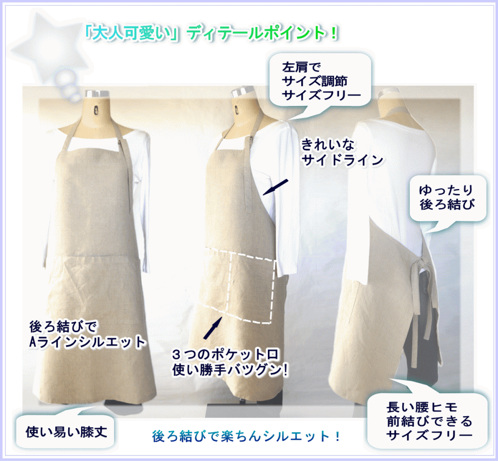 日本サイズの9号です 商品創りコンセプト 普段着もお洒落で楽しい毎日を イメージしてデザインをしています 大人可愛いアイテムを中心に カフェエプロン・エプロンドレスなど いろんなサイズ の方に 動きやすく、着易いデザインを フリーサイズで提案します ジャ ケット・ボトムなどに使われる素材を使い 上質で洗濯機洗いによるダメージの少ない縫製 丈夫な縫い目、裁ち切りを見せない丁寧な仕様 オリジナル・ハンドメイドの魅力 工場直接出荷だからできるサービス お直し、サイズオーダー詳細はコチラリネン変更・・・・サンドベージュ ・大きなポケットでドラえもん気分になれます。