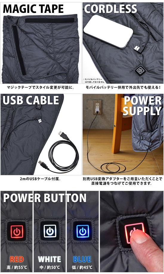 ●USB電源使用 コードレスで外出先でも使える 電源はUSB電源だから、外での防寒にもぴったり。